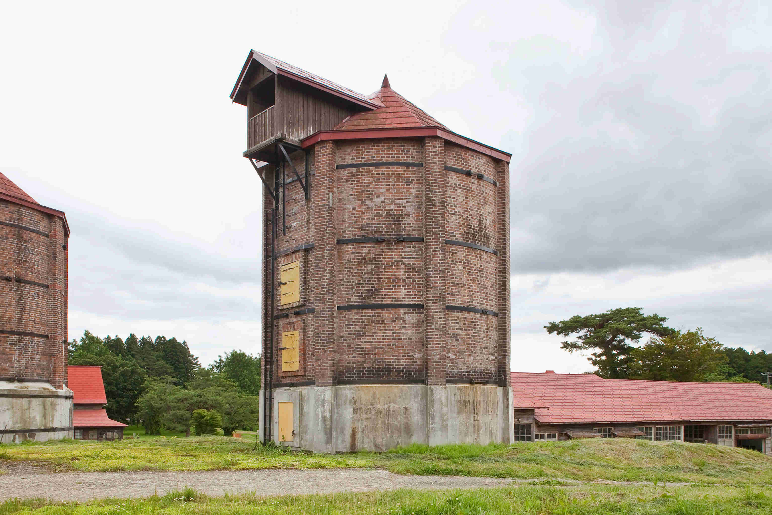 レンガ造の巨大サイロ。日本に現存する最も古いサイロといわれる。昭和50年代まで使用。