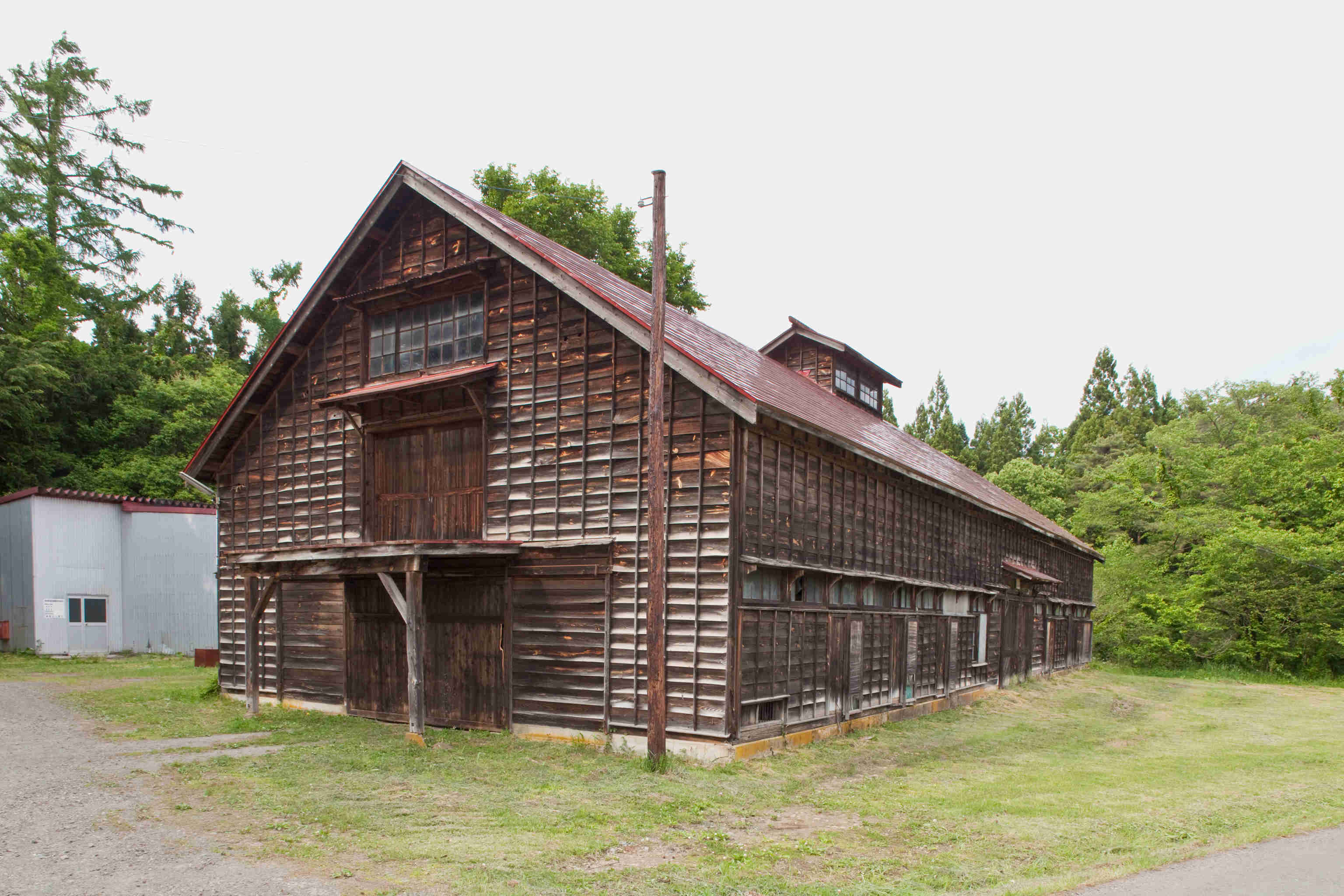 本部附属の倉庫として建設。雨の日でも作業できる広い下屋が特徴。現在も倉庫として使用中。
